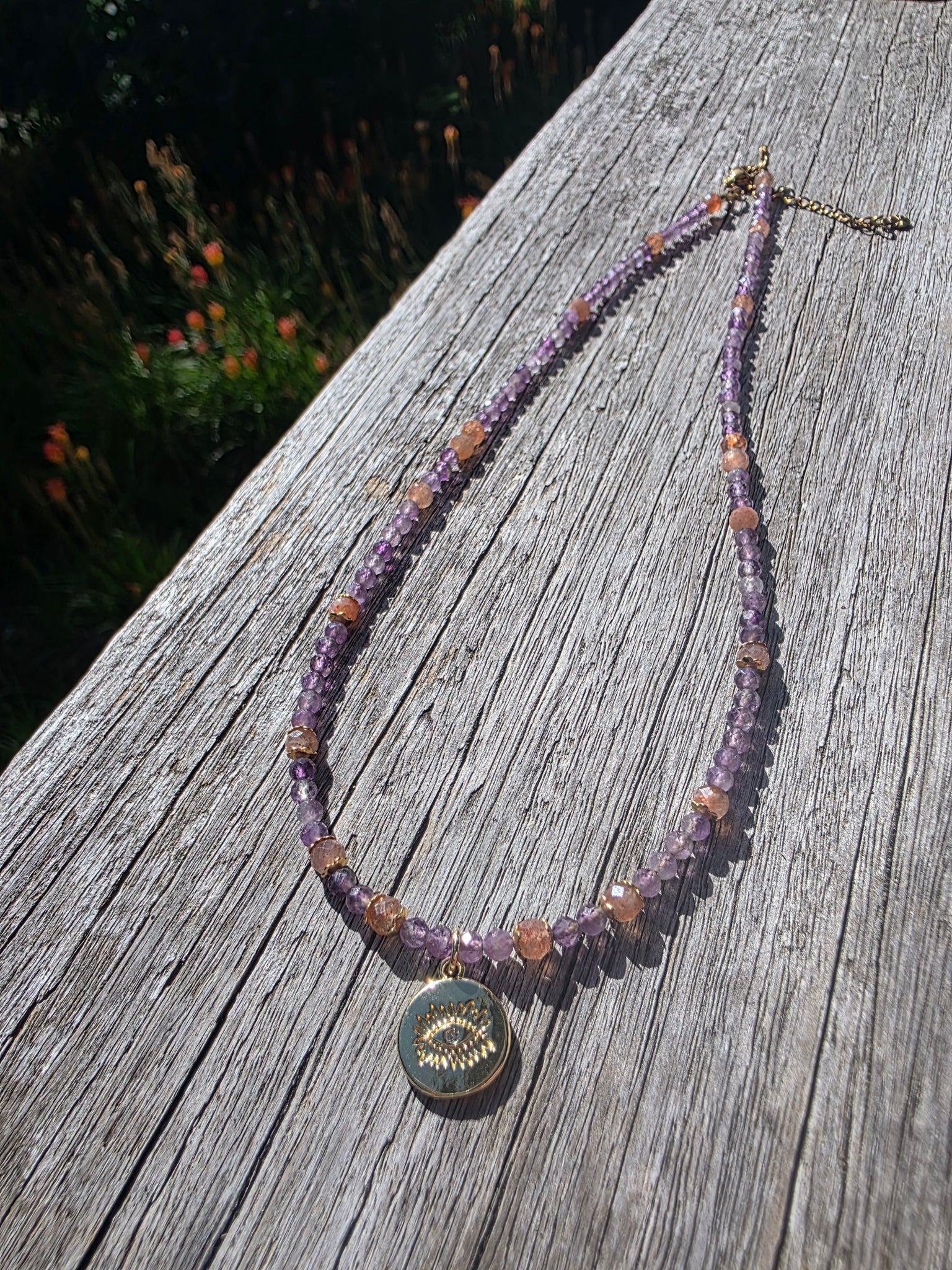 The Sun and Spirit Necklace is handcrafted using fine 3–4mm faceted amethyst and sunstone beads, finished with a delicate gold-plated protection charm — a modern interpretation of the ancient eye symbol, long associated with warding negativity and safeguarding energy.