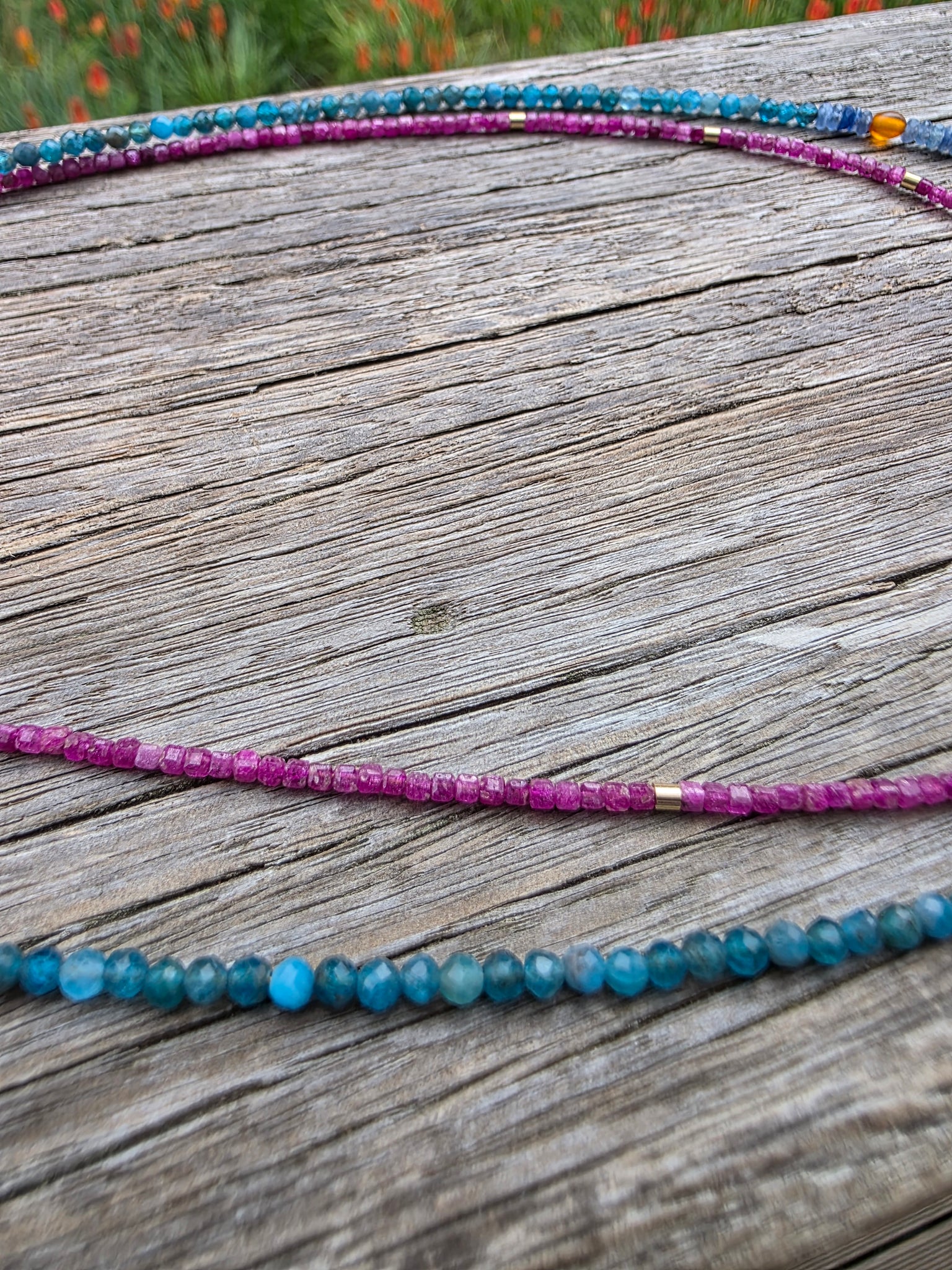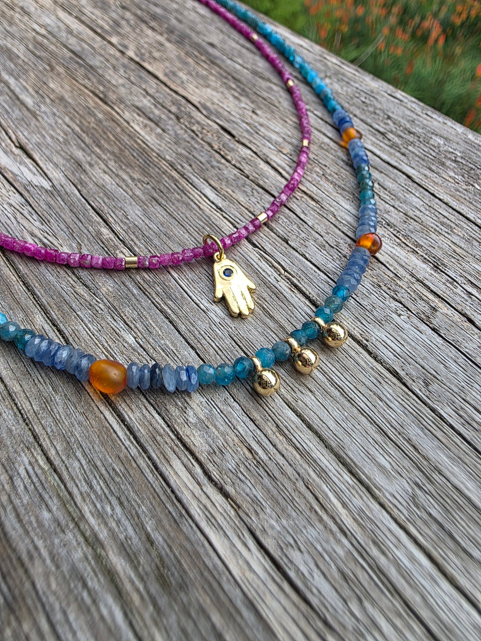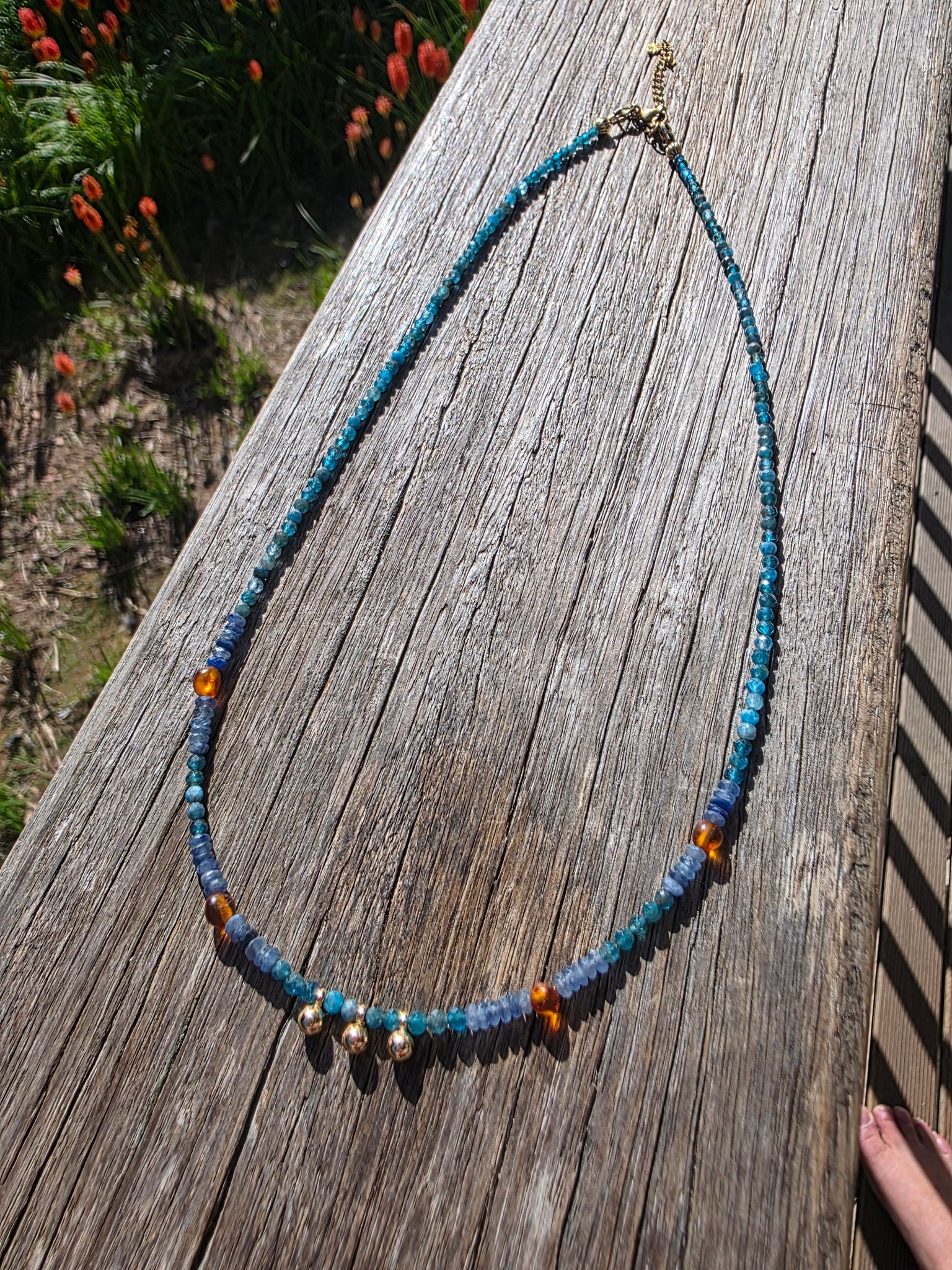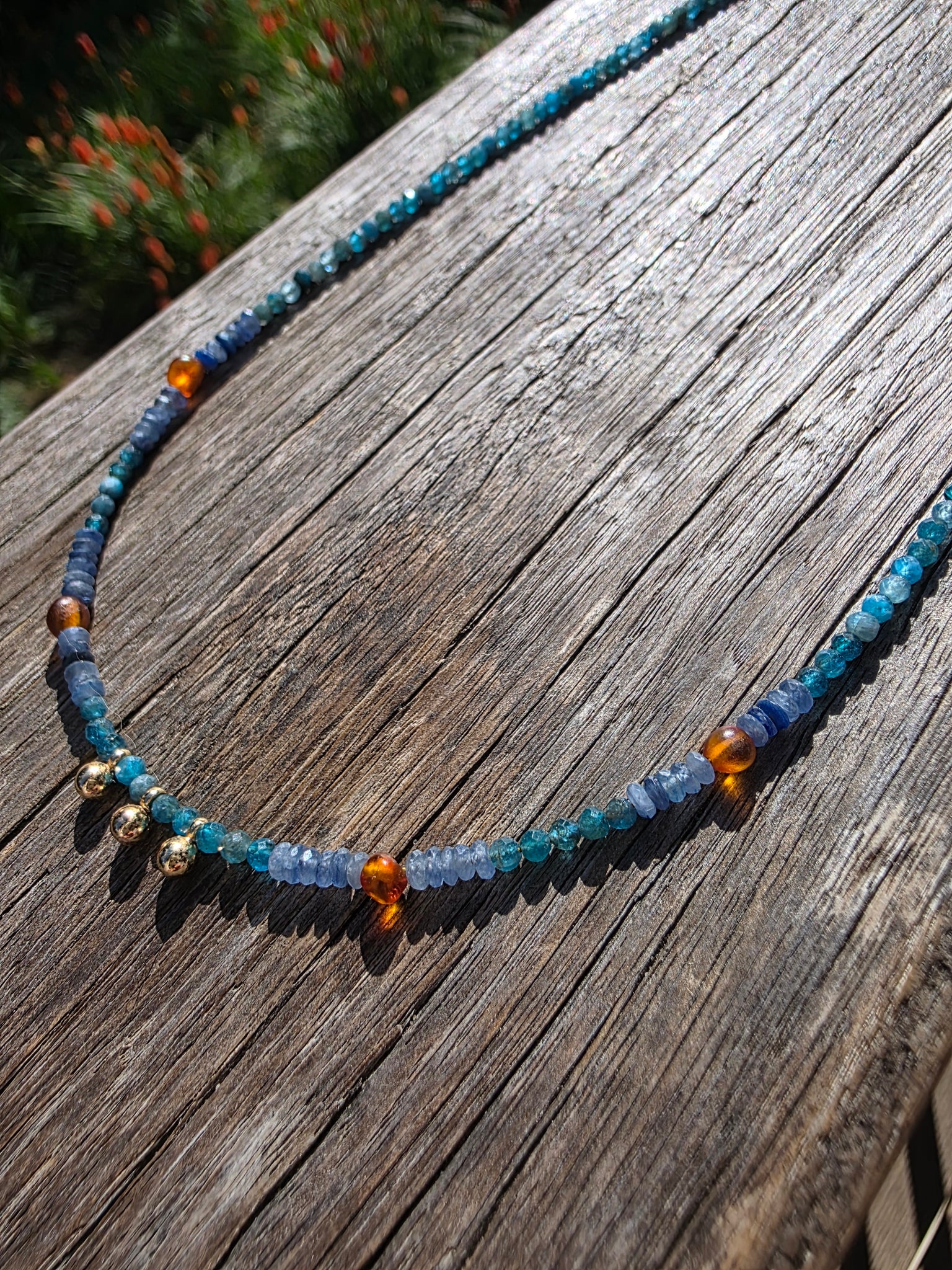 Ocean Light Necklace – Blue Kyanite, Blue Apatite & Baltic Amber, 18k Gold PVD plated findings.