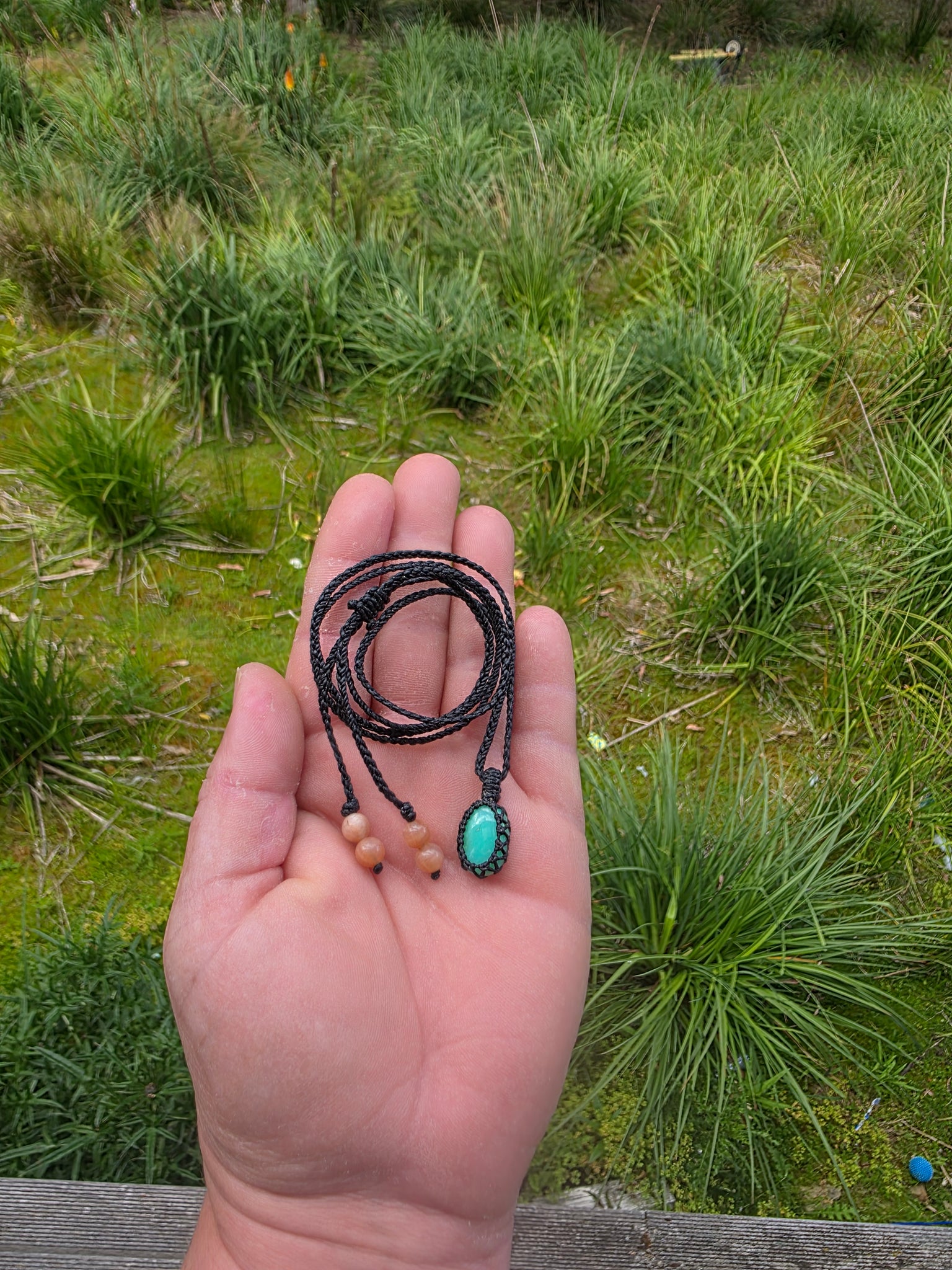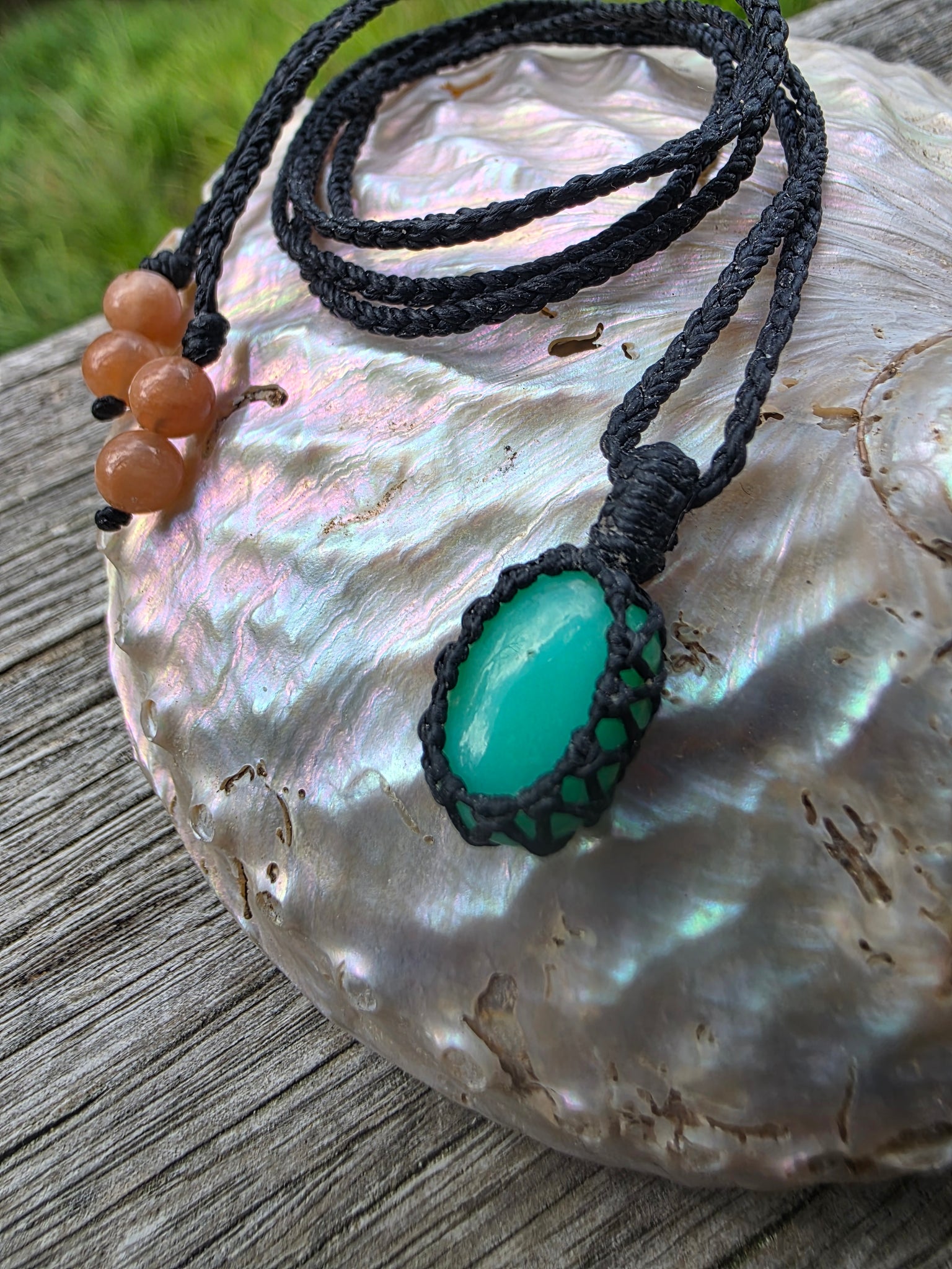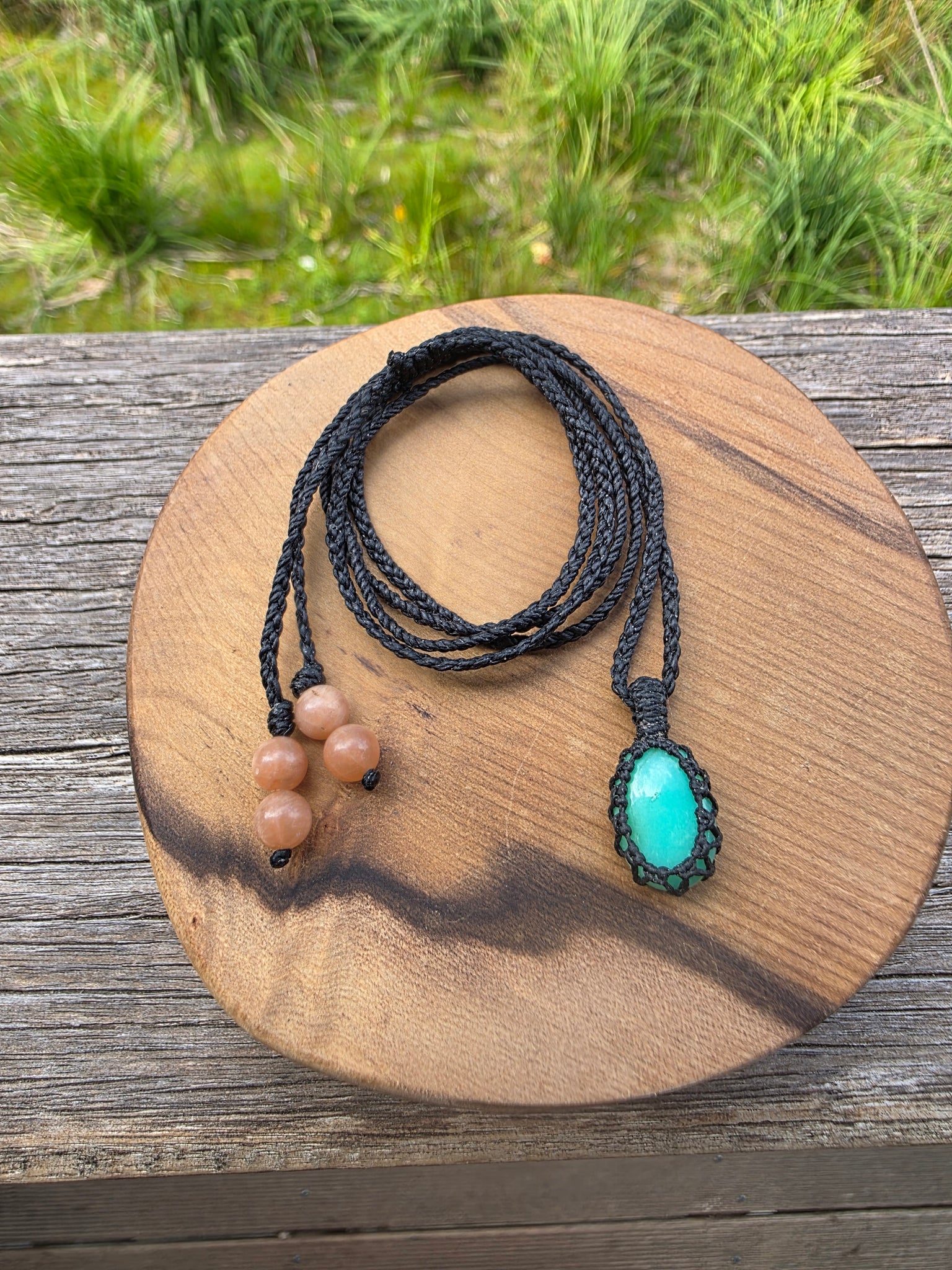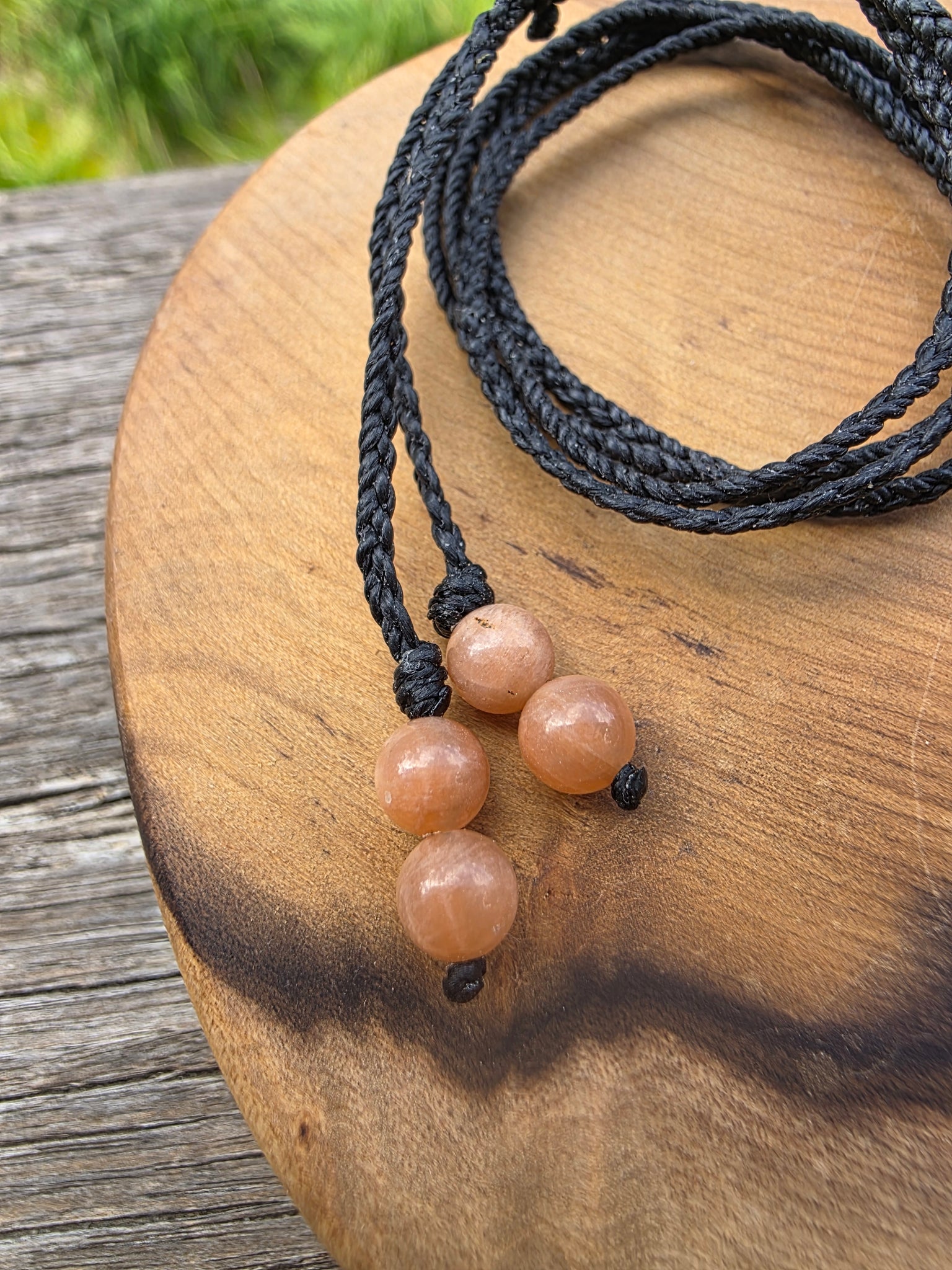 I strung this pendant on a 74cm hand braided adjustable cord. The stopper beads are Peach Moonstone.