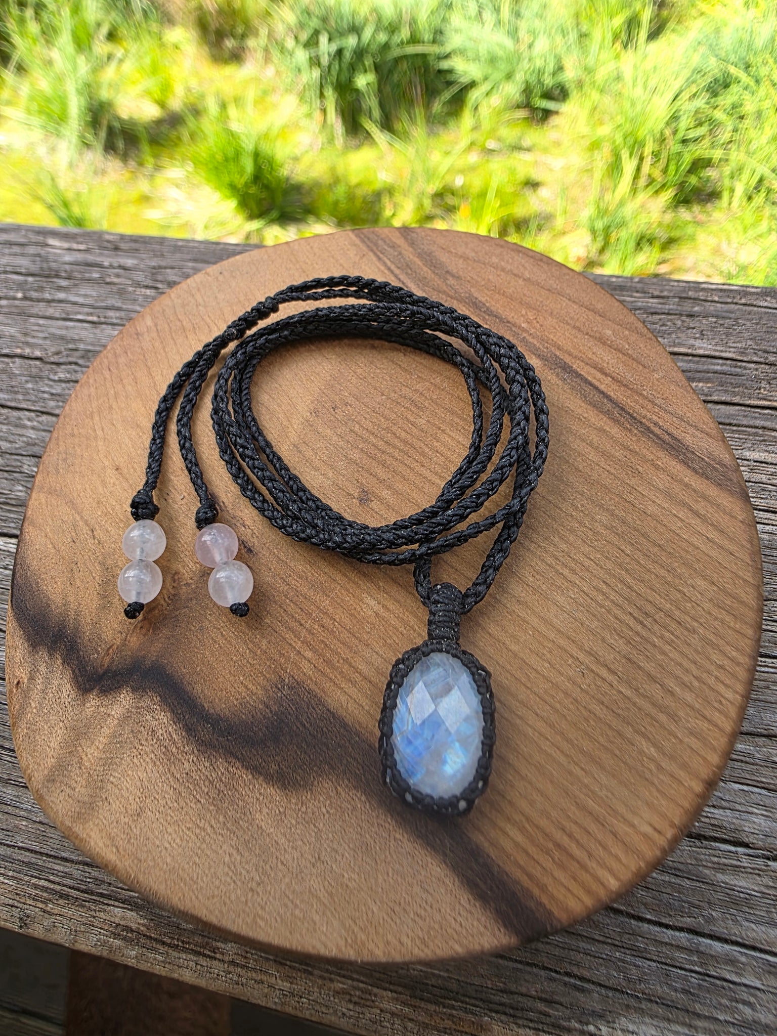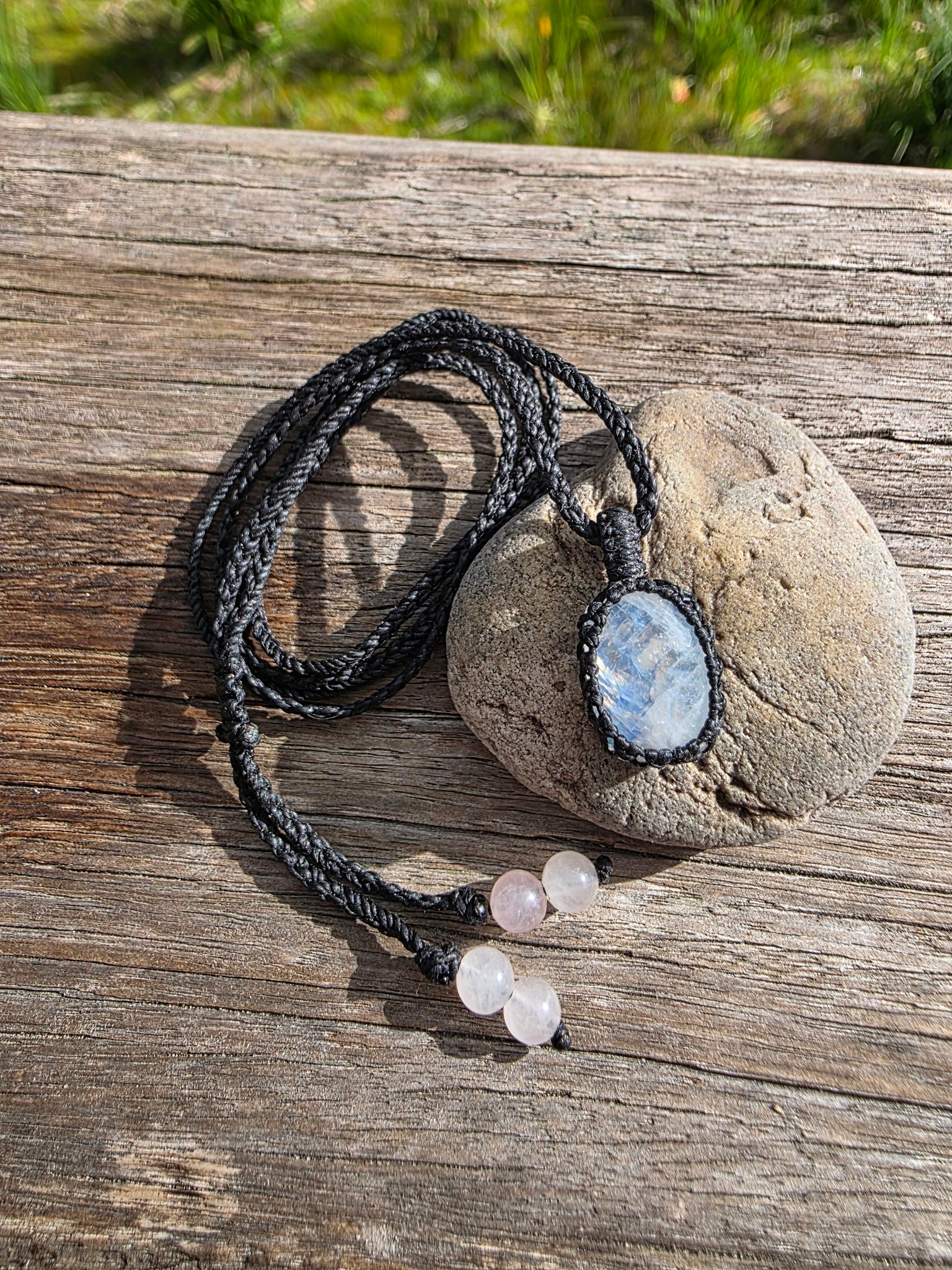 I strung this pendant on a 76cm hand braided adjustable cord. The stopper beads are Rose Quartz.