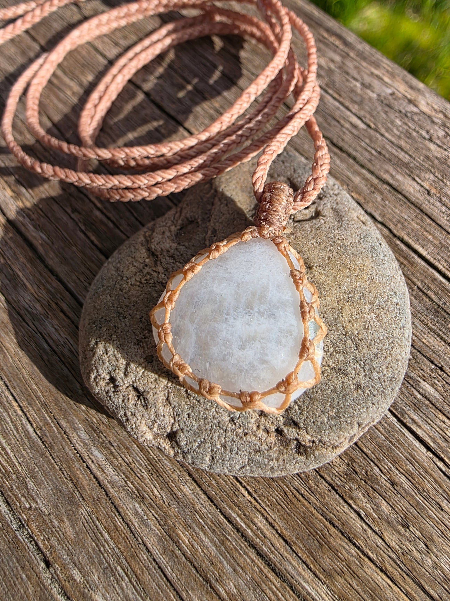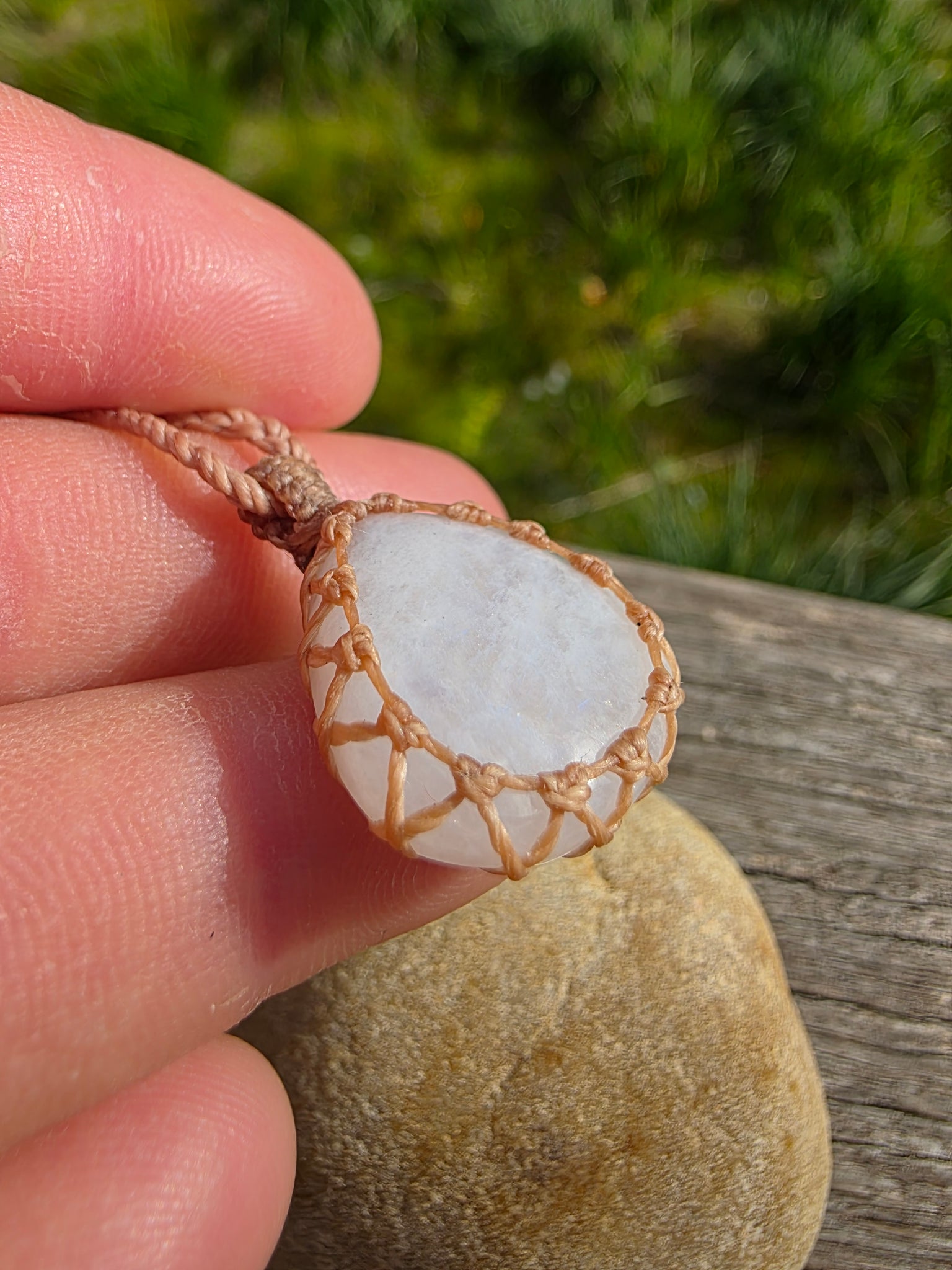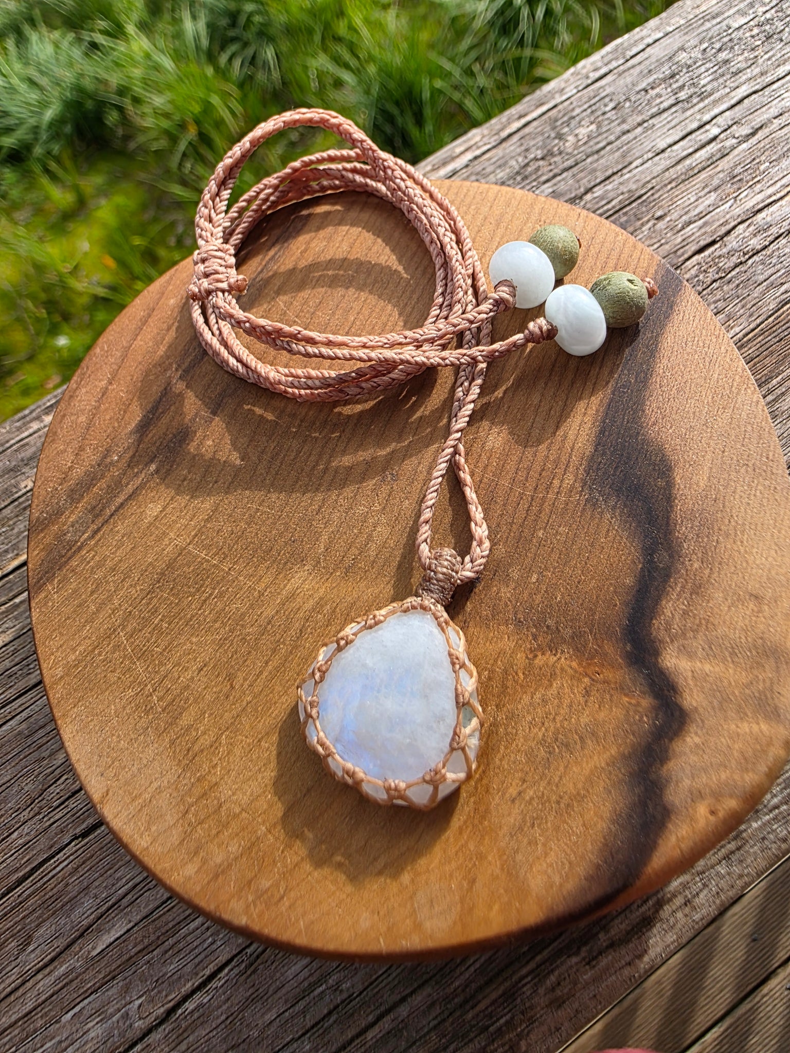 I strung this pendant on a 84cm hand braided adjustable cord. The stopper beads are White Moonstone and Green Sandalwood.